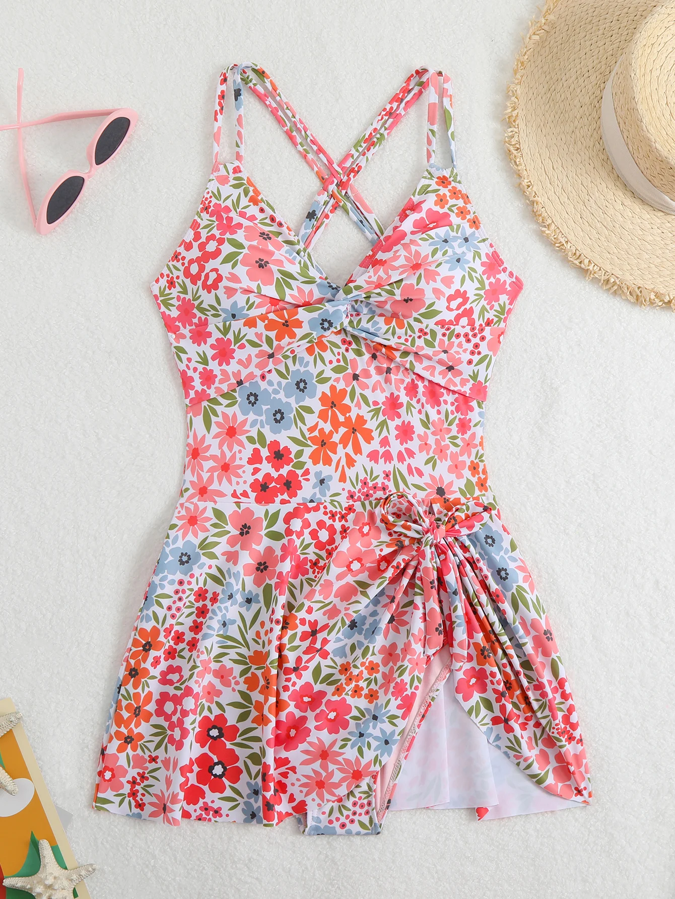 Traje de baño enterizo con falda cruzada twist y diseño compacto para llevar. Estilo moderno y práctico, perfecto para lucir junto a la piscina.